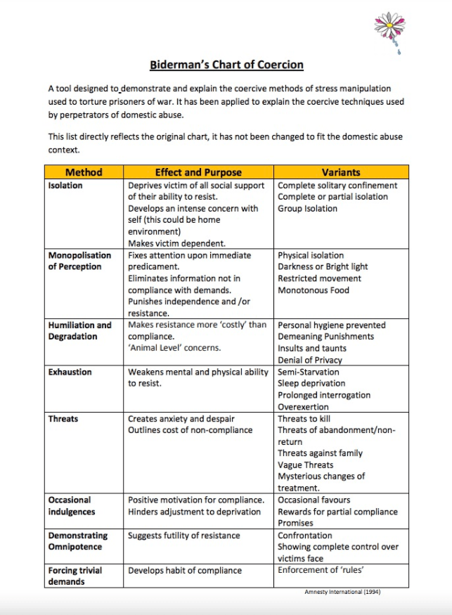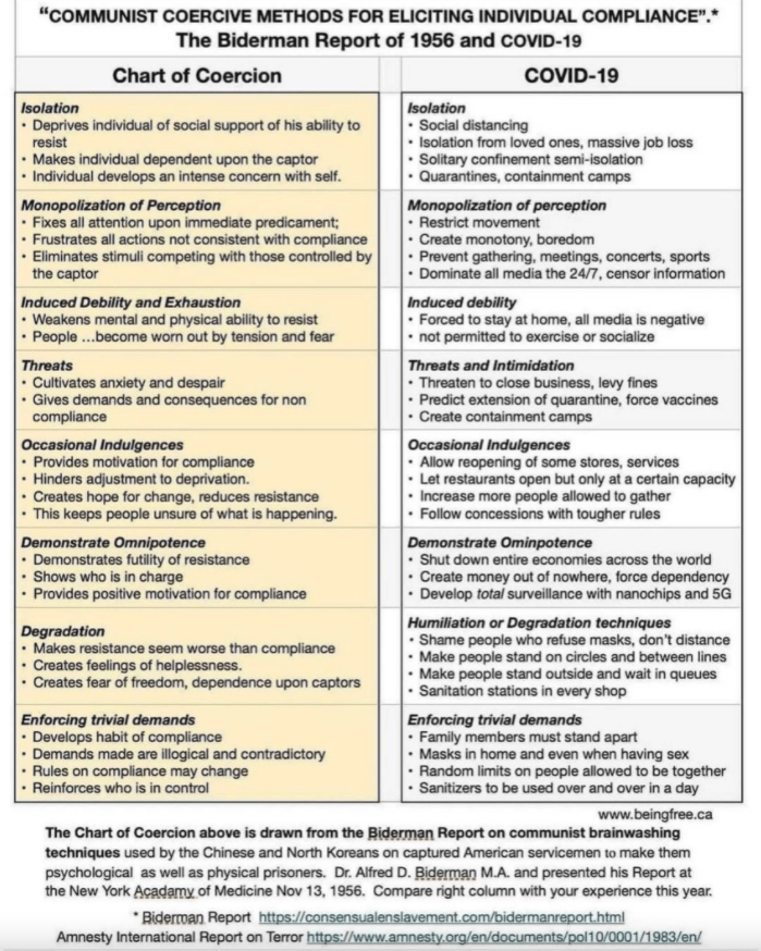In 1961 The Manipulation of Human Behavior by Alfred Biderman was published. This chart summarizes his book.