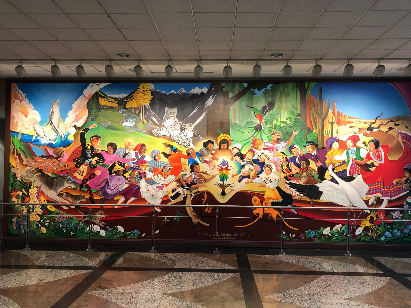 Among some of the strangest art that populates the surrounding grounds and terminals of Denver International Airport (DIA) are two murals that were commissioned and installed when the airport was being built in 1995, by local artist Leo Tanguma.