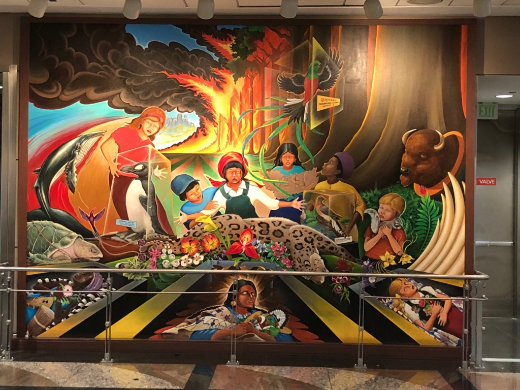 The first section of this mural by Tanguma shows a brightly colored horrific scene of trees burning in the background, animals in glass cages, girl lying in a coffin, and young people fleeing the scene while crying. Some seriously dark and scary stuff to be sure. In the second section of the mural though, we see a diverse number of children and animals coming together around a futuristic plant.