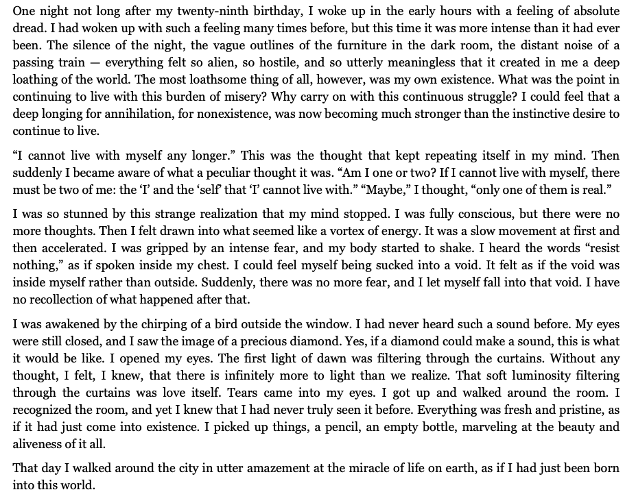 Eckhart Tolle in the introduction to his book, The Power of Now describes his transition from left brain to right brain reality.