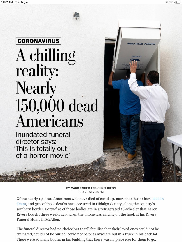 So gruesome I stopped eating my popcorn. Only the”out of a horror movie”of this headline rings true in this dramatic staged event. Perhaps you thought there’s a corpse in that box? Look again. If there’s a corpse in the box how could one man carry it on his head? In fact the box doesn’t look wide enough for a body. I think it’s a floral delivery. Although possible, it is unlikely to have that many deaths in Hidalgo County and have a death rate much higher than the national average. Besides the test for Covid-19 tests for a DNA sequence that almost everyone has.