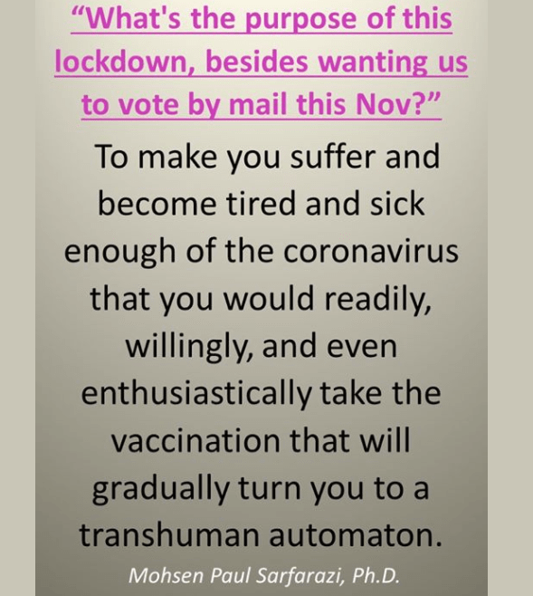 What is the propose of all this endless media hoopla about Covid-19? The government really wants you to get the wonderful, life saving, ghost exorcising, monster vanquishing, hair saving vaccine that David Icke says will contain, “nanobots that are capable of sending and recieving signals to influence your thoughts and emotions, a DNA modifier to prepare you to become a post human cyborg and an agent to sterilize you to decrease the population.” This quote was taken from an interview Icke gave on July 2nd. Go to Digital Freedom Platform Rose/Icke V The Answer to see the complete interview.